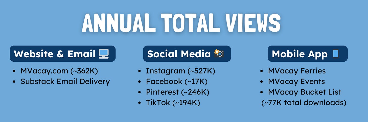 MVacay is a web + email–first publication, with social media extending that reach. While email is the biggest driver, a meaningful share of readers find MVacay outside the inbox via direct visits, Google/search, social, and the Substack app.