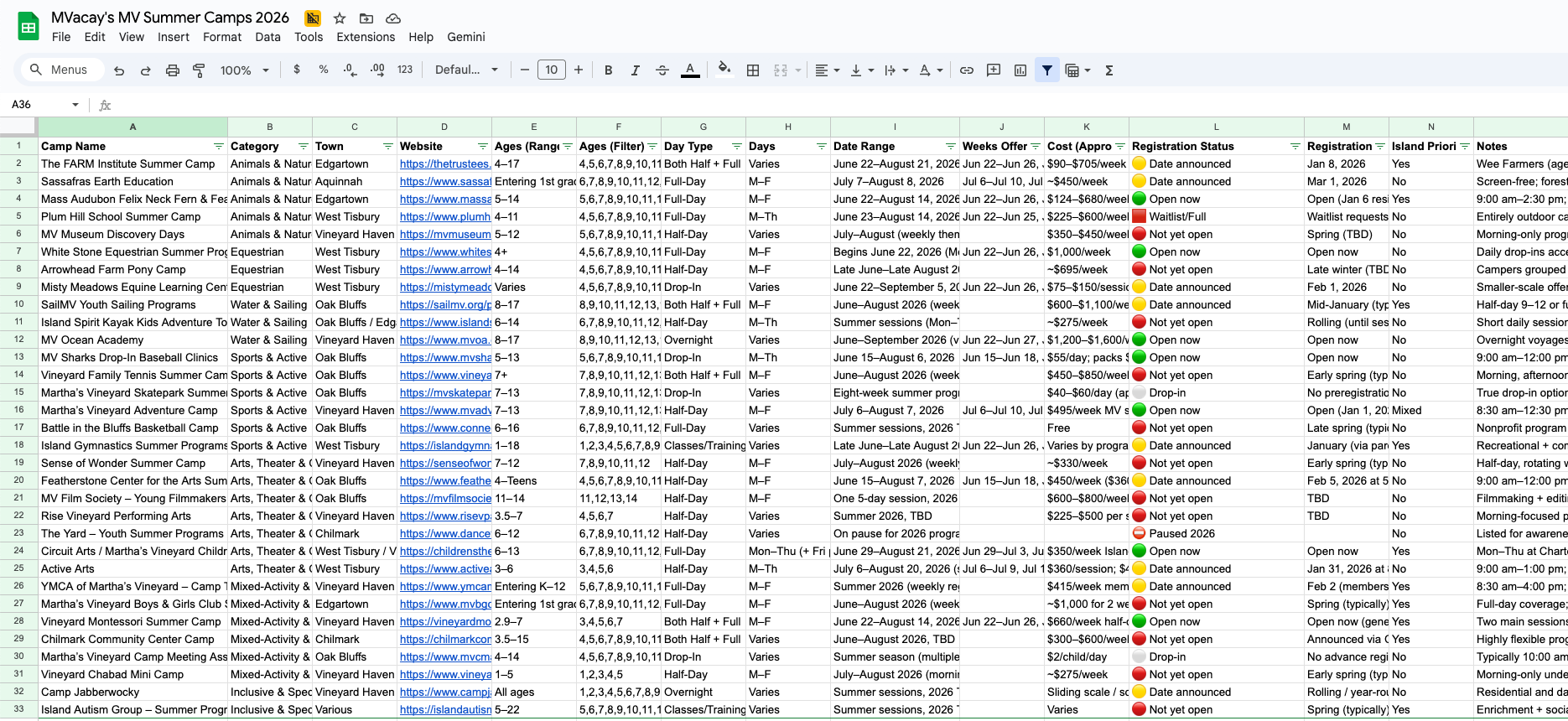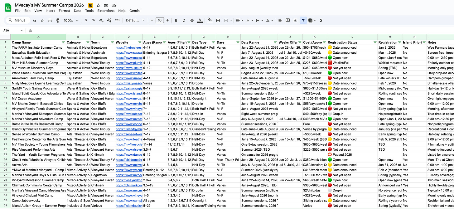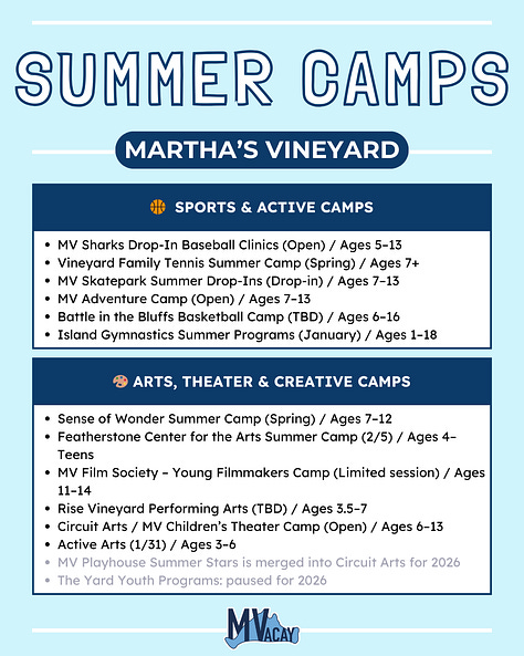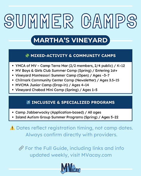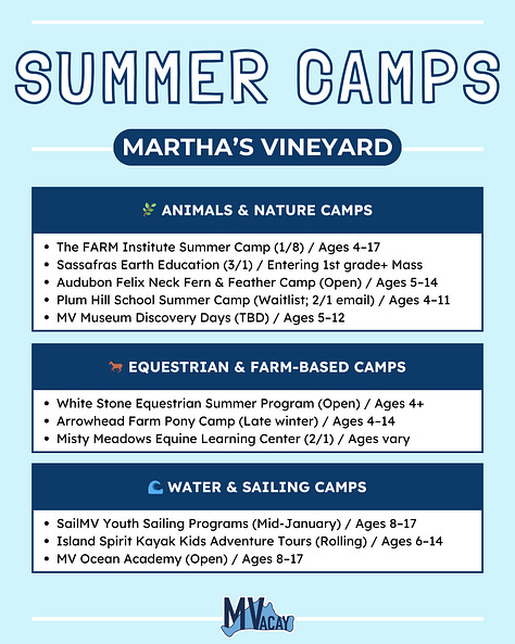 Want this organized in one place? Paid subscribers get access to a filterable spreadsheet of all 31 Martha’s Vineyard summer camps—making it easy to compare options, spot what’s open, and plan week by week.